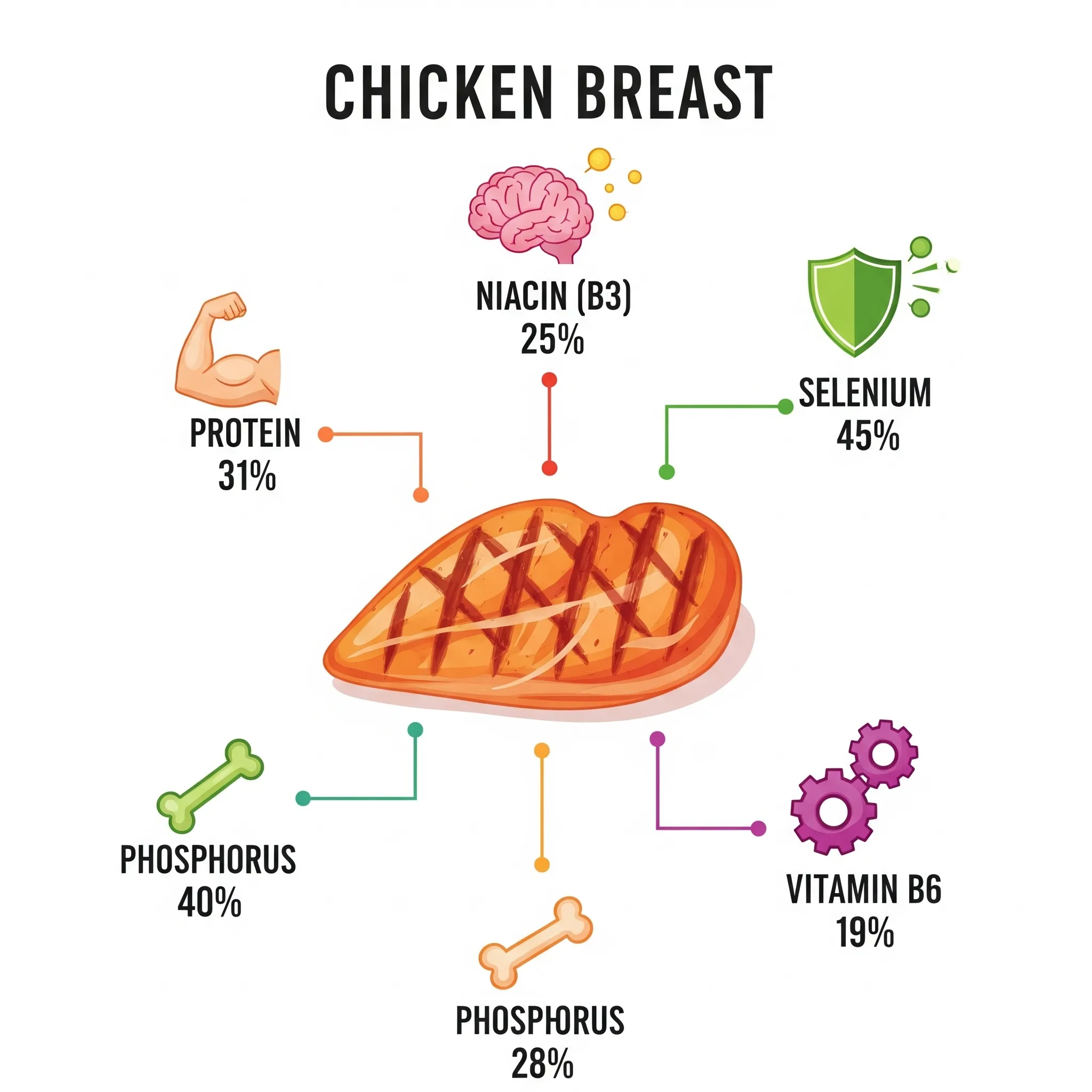 - سلنیوم: یک ماده معدنی کمیاب با خواص آنتیاکسیدانی قوی است. سلنیوم برای عملکرد صحیح غده تیروئید، حمایت از سیستم ایمنی و محافظت از سلولها در برابر آسیبهای ناشی از رادیکالهای آزاد ضروری است. تنها یک وعده ۱۰۰ گرمی سینه مرغ میتواند بیش از نیمی از نیاز روزانه بدن به سلنیوم را تأمین کند.